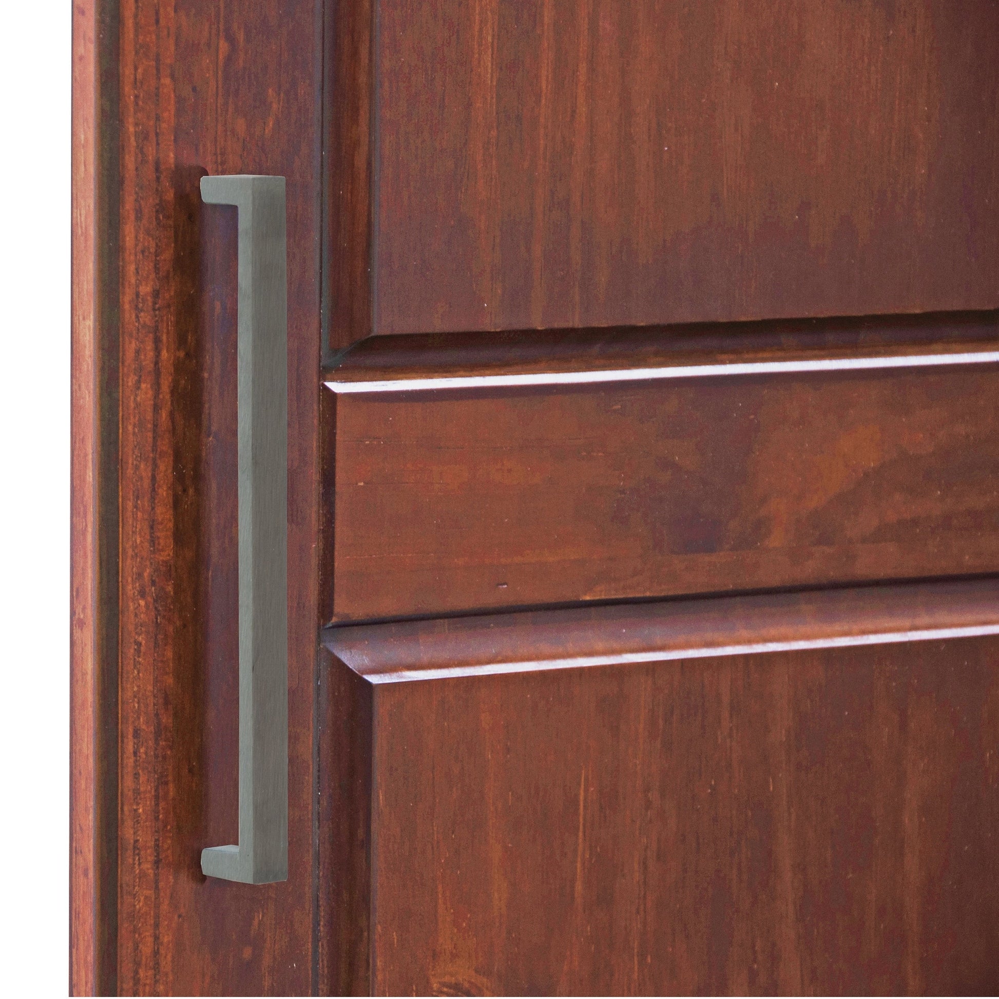 - Poignées métalliques modernes à espacement de 6-5/16 pouces, finition satinée brossée.