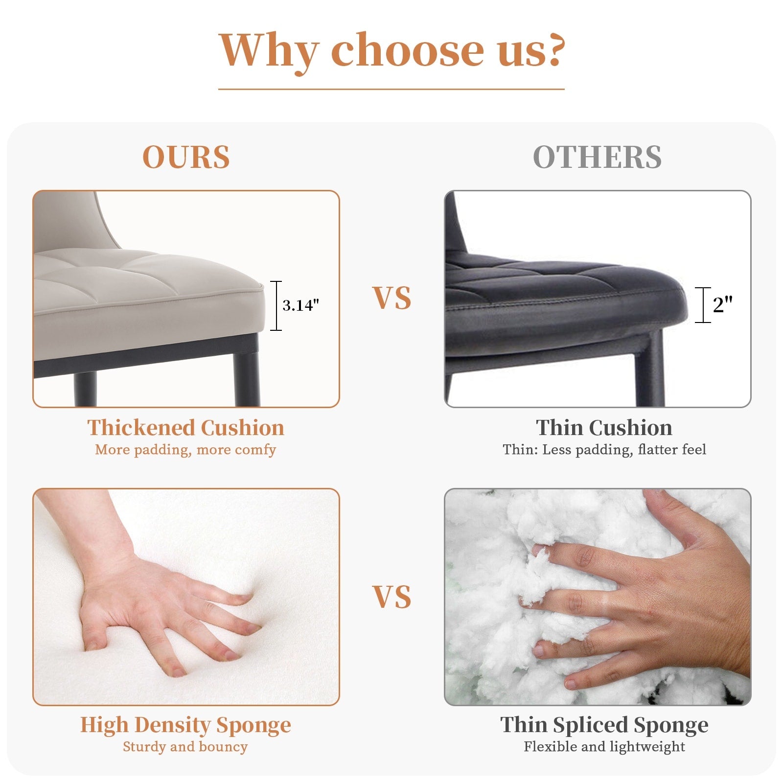 Rehaussez votre salle à manger avec ces élégantes chaises de salle à manger contemporaines recouvertes de simili cuir. Leurs lignes épurées et fluides ajoutent une touche de sophistication à votre espace, tandis que l'assise confortable rembourrée de mousse haute résilience et le dossier haut les rendent parfaites pour les longues assises. Fabriquées avec du cuir PU haut de gamme, imperméable, résistant à l'huile et à la saleté, ces chaises de salle à manger sont faciles à nettoyer et à entretenir. Le cadre métallique intégré robuste supporte jusqu'à 200 kg (440 lbs), garantissant stabilité et durabilité. Parfaites pour tout décor, que ce soit chez vous, au bureau ou dans un restaurant !
