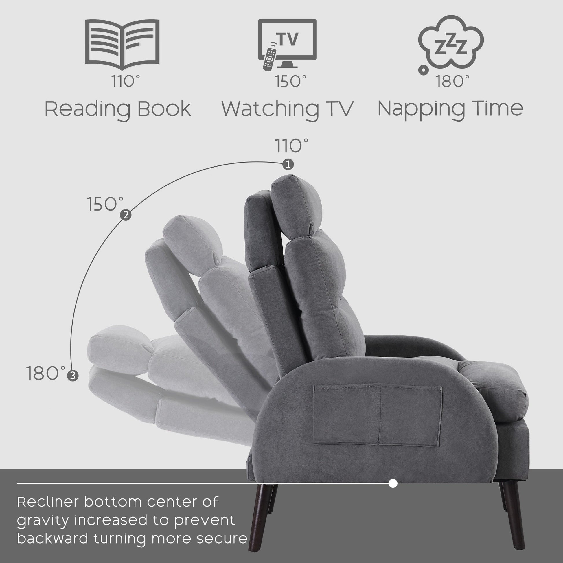 - Confort ajustable : Dotée de trois réglages du dossier à 110°, 150° et 180°, cette chaise d’appoint est conçue pour répondre à diverses préférences de position assise et besoins de relaxation. Que vous vous reposiez, lisiez ou regardiez la télévision, vous pouvez facilement ajuster la chaise pour trouver la position idéale pour un confort optimal.