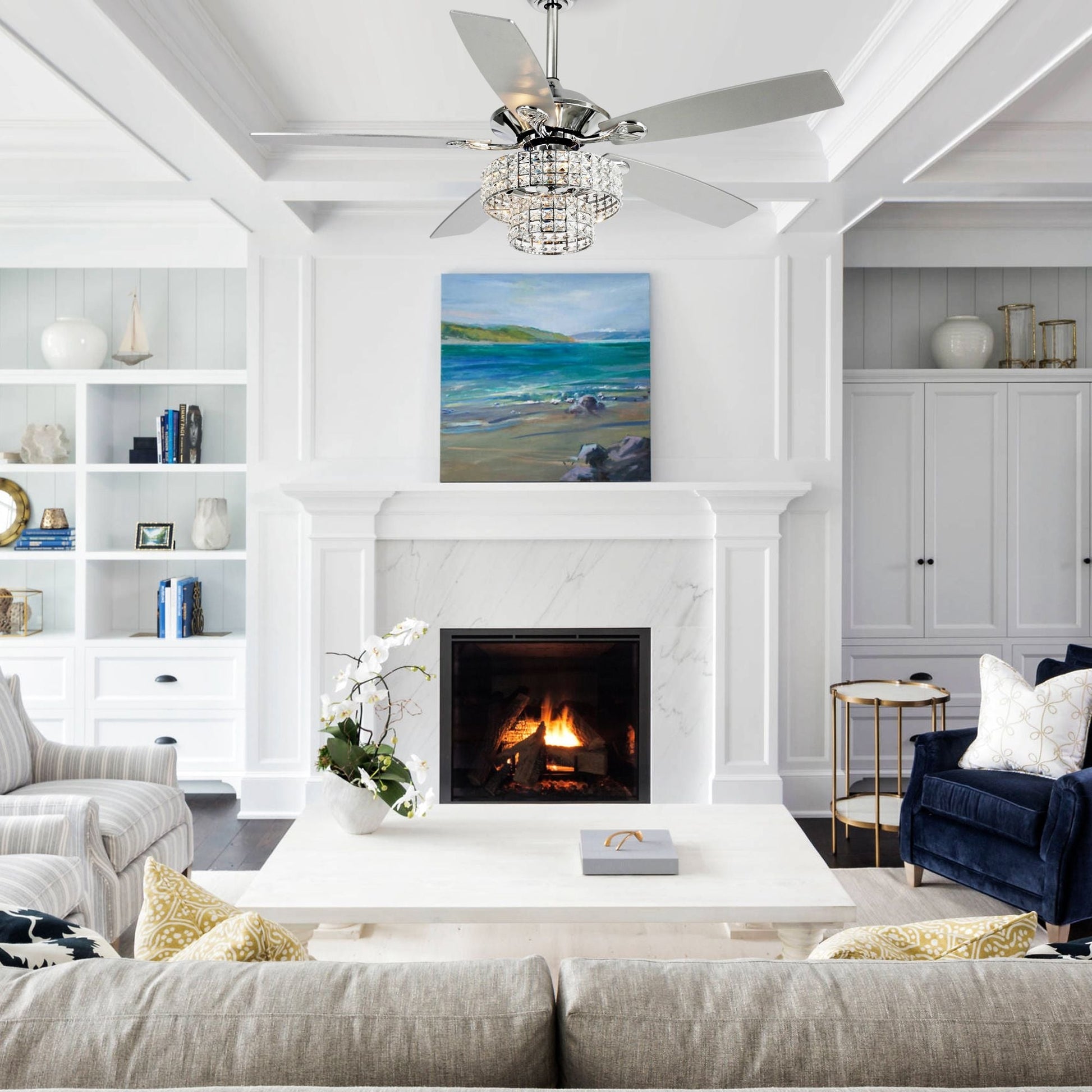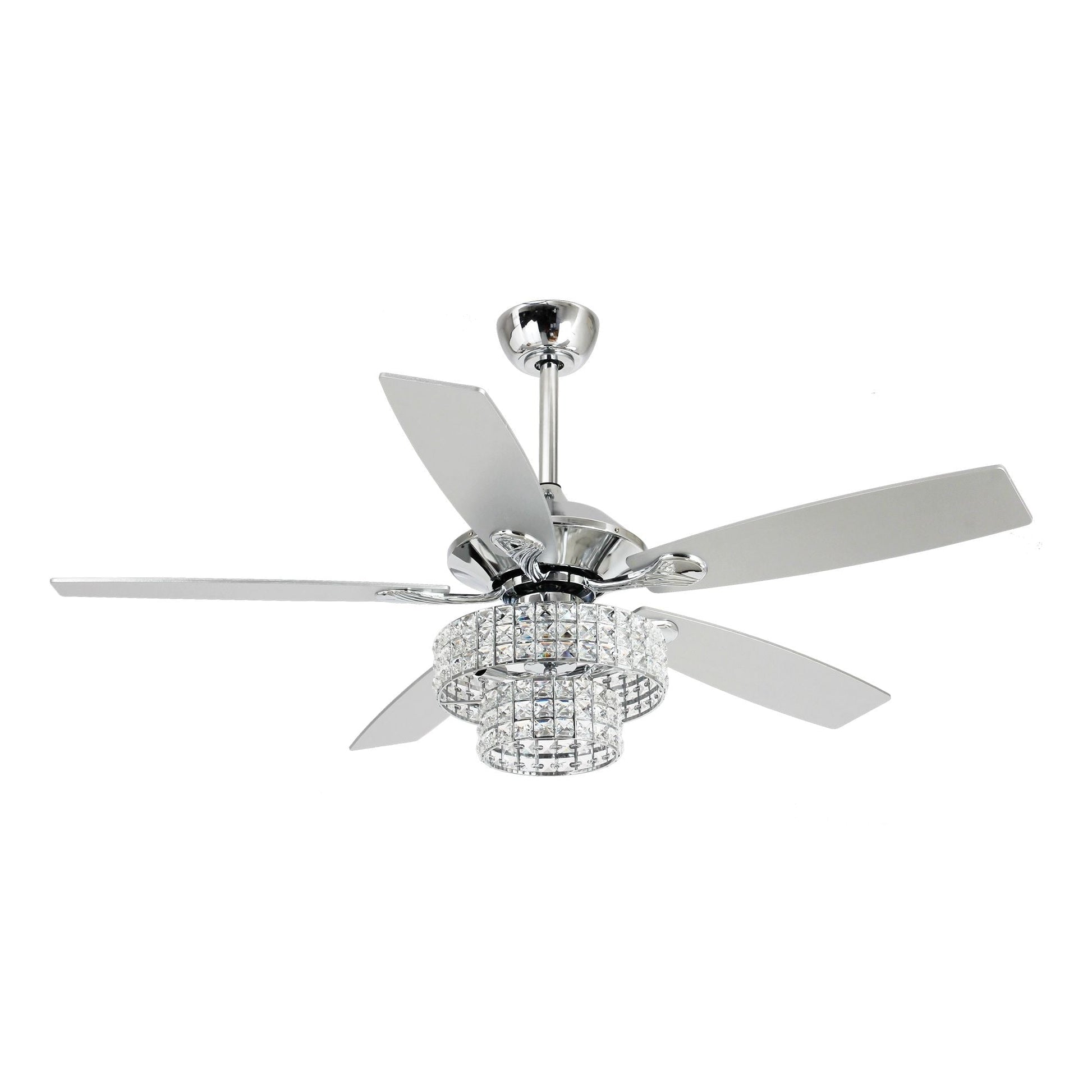 Ventilateur de plafond moderne à 5 pales en bois chromé de 52 pouces avec télécommande et cristaux.