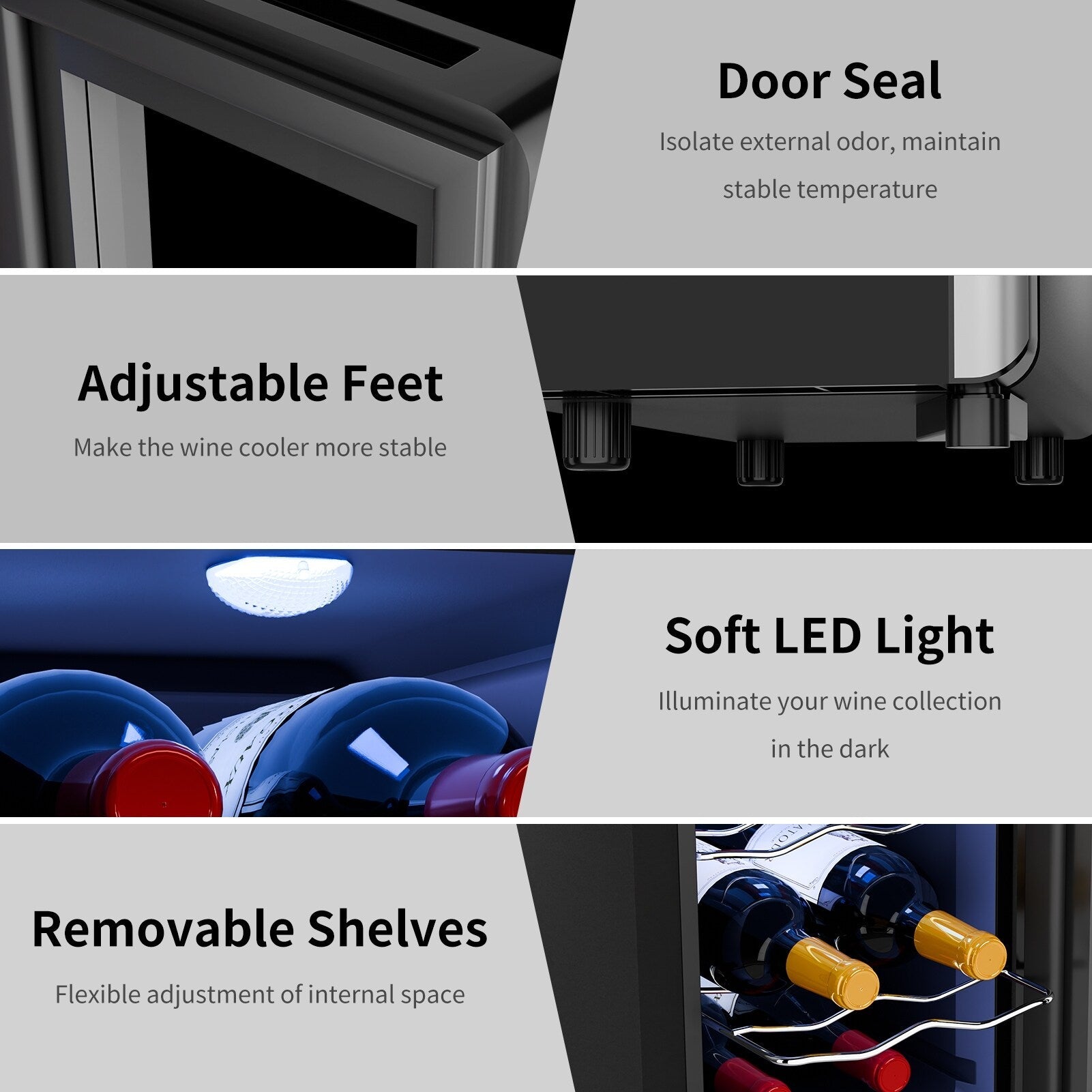 Joint de porte : Le joint de porte de haute qualité isole les odeurs extérieures et maintient une température interne stable, garantissant que votre vin reste insensible aux facteurs externes.