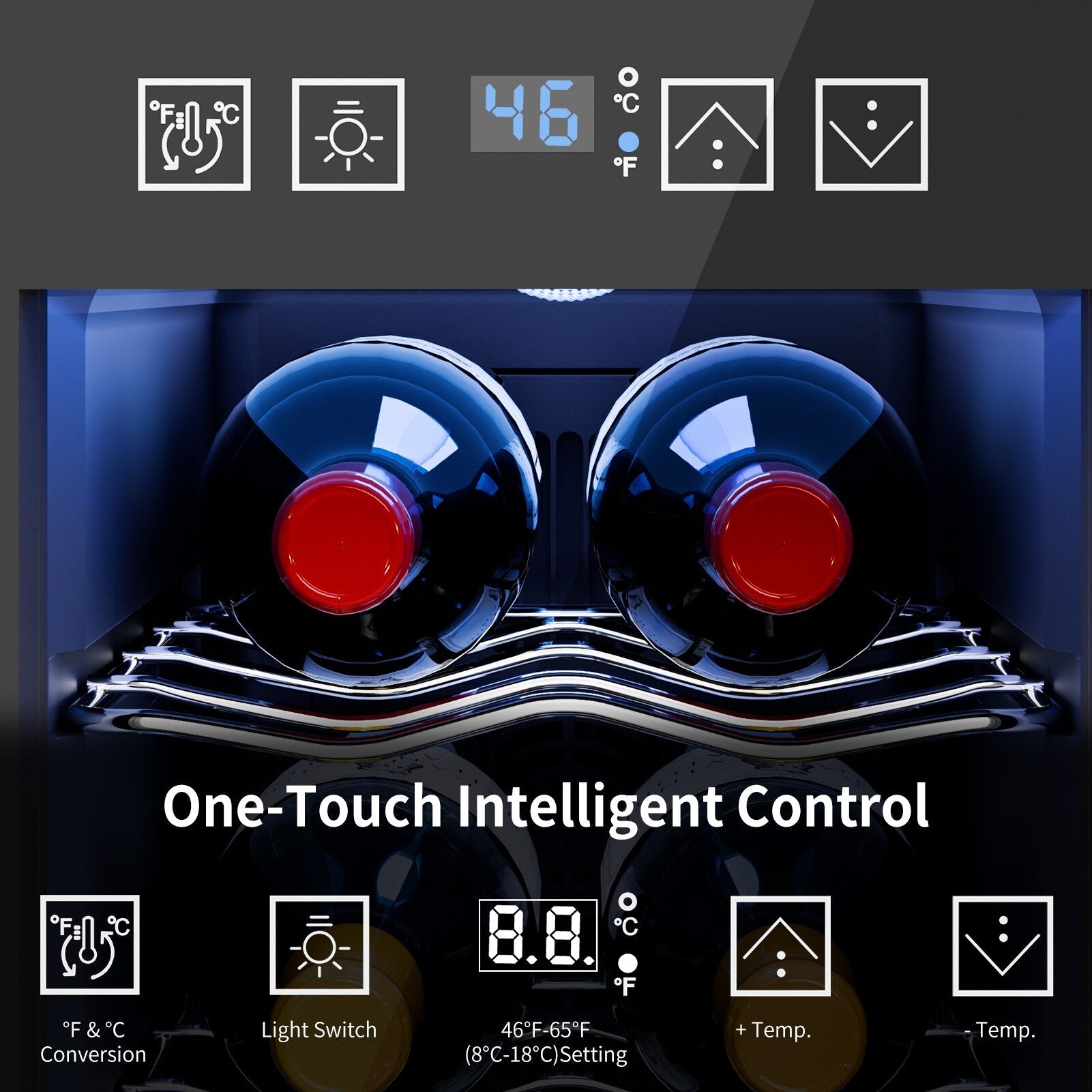 Contrôle intelligent à une touche : L’écran tactile intuitif permet une utilisation facile. Vous pouvez régler la température entre 8 et 18 °C (46 et 65 °F), allumer ou éteindre le témoin lumineux LED, et même convertir les températures Fahrenheit en Celsius (et vice-versa) en quelques clics.