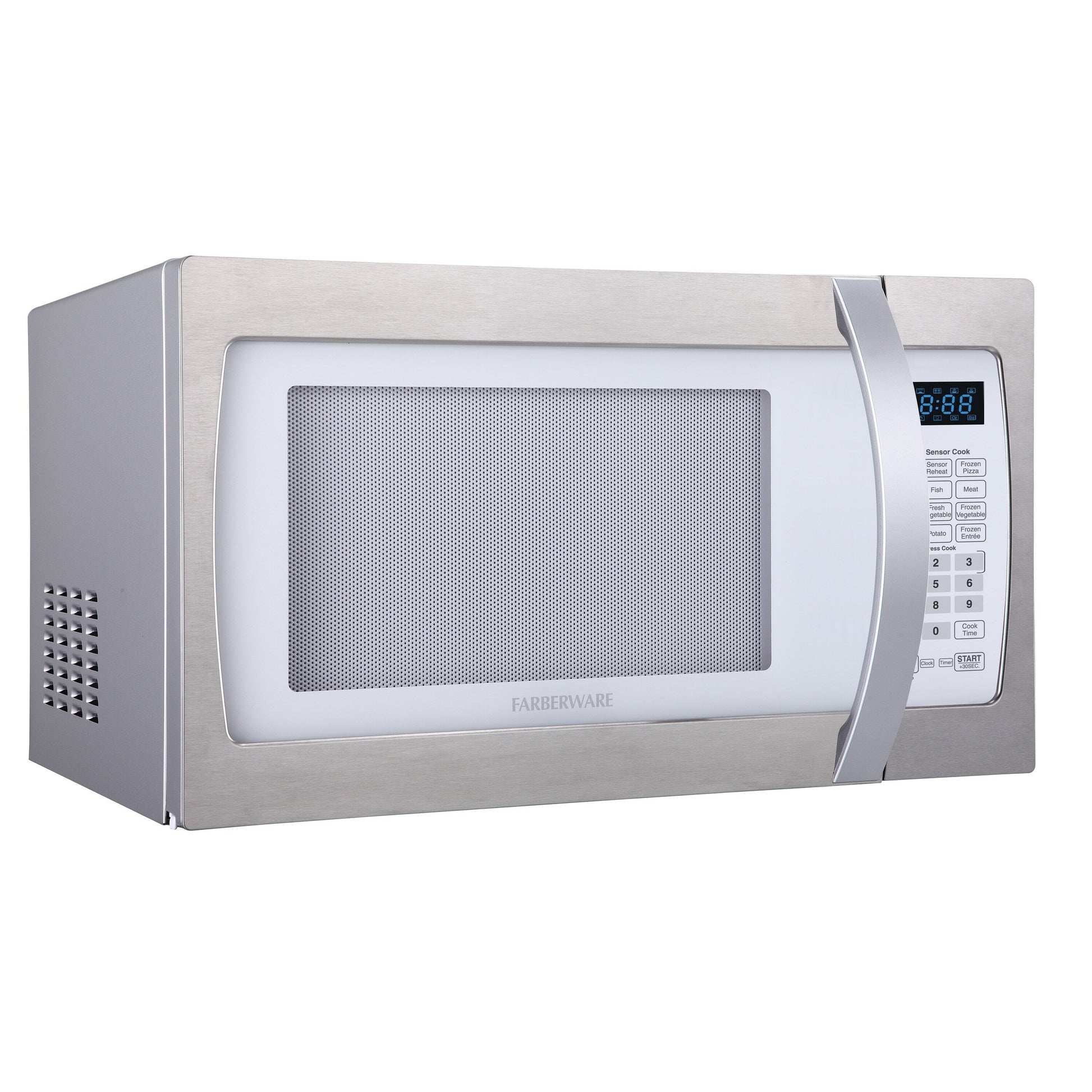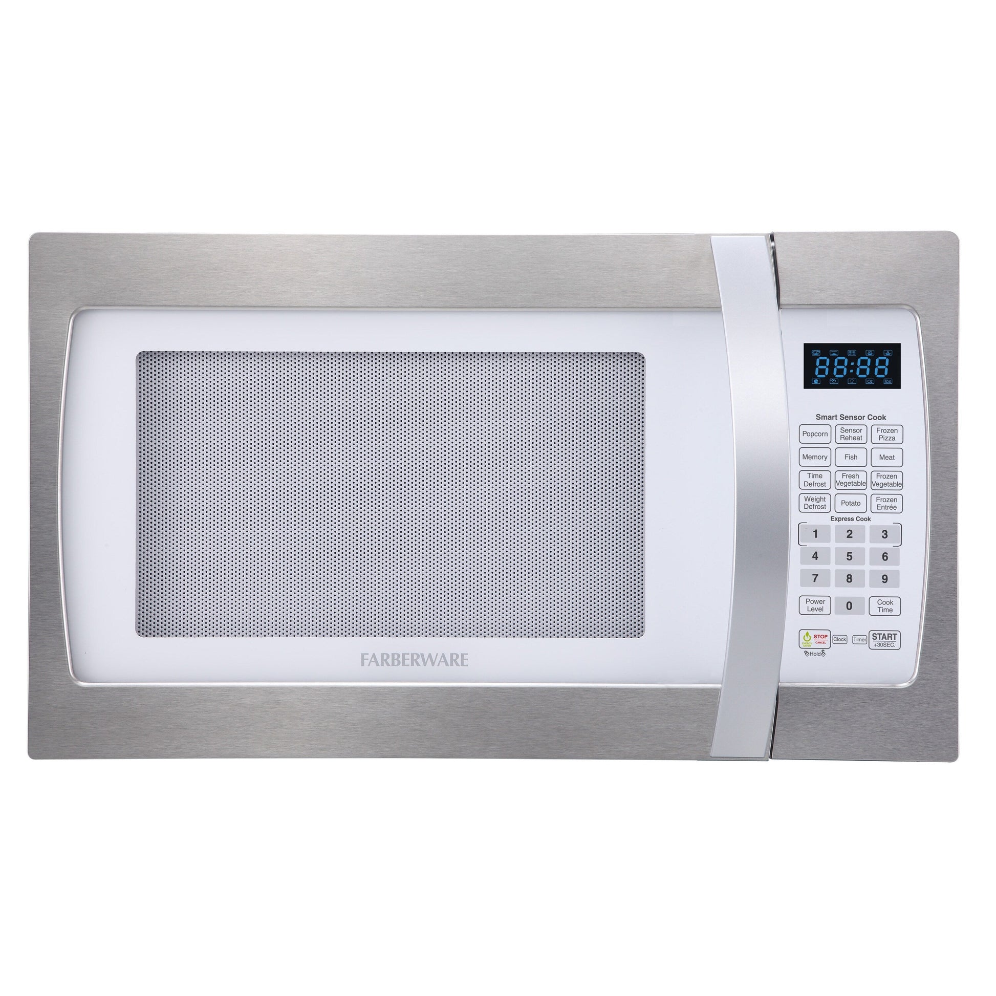 Four à micro-ondes Farberware Professional de 1,3 pi³ et de 1100 watts avec fonction de cuisson intelligente à détecteur, blanc et platine