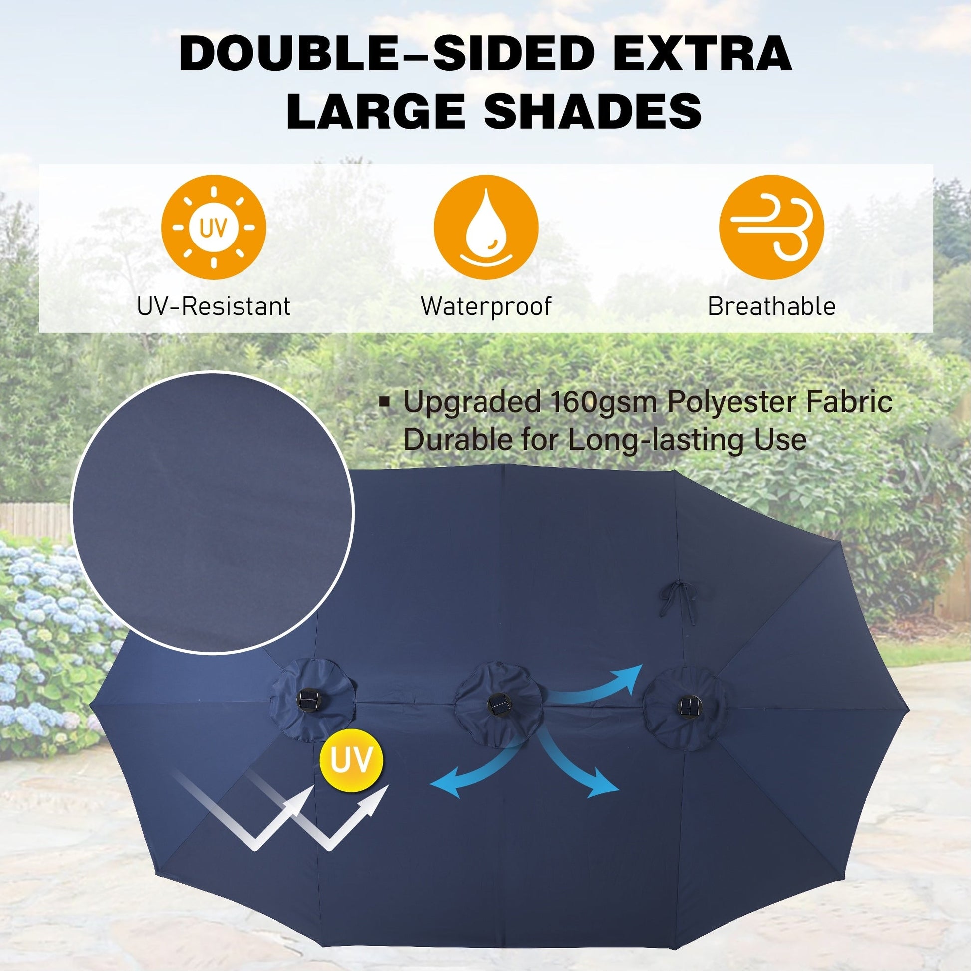 Transformez votre espace extérieur avec ce magnifique parasol de terrasse double face de 4,5 m (15 pieds). Profitez d'une ouverture et d'une fermeture faciles grâce à la manivelle facile à utiliser qui fonctionne en seulement 5 secondes. La magnifique toile est fabriquée à 100 % en polyester, ce qui garantit qu'elle est imperméable, résistante à la décoloration et à la protection UV, vous offrant un confort respirant par tous les temps. De plus, il est équipé de 36 lumières LED (3 sur chaque baleine) alimentées par 3 panneaux solaires, créant une atmosphère chaleureuse avec un système de charge automatique pour votre confort.