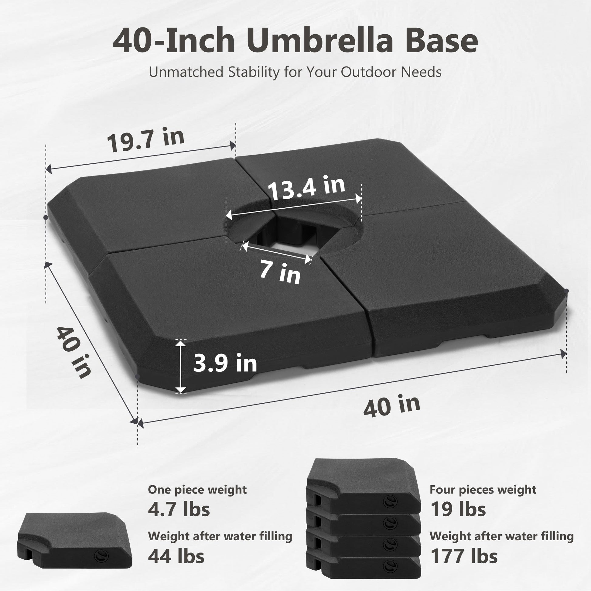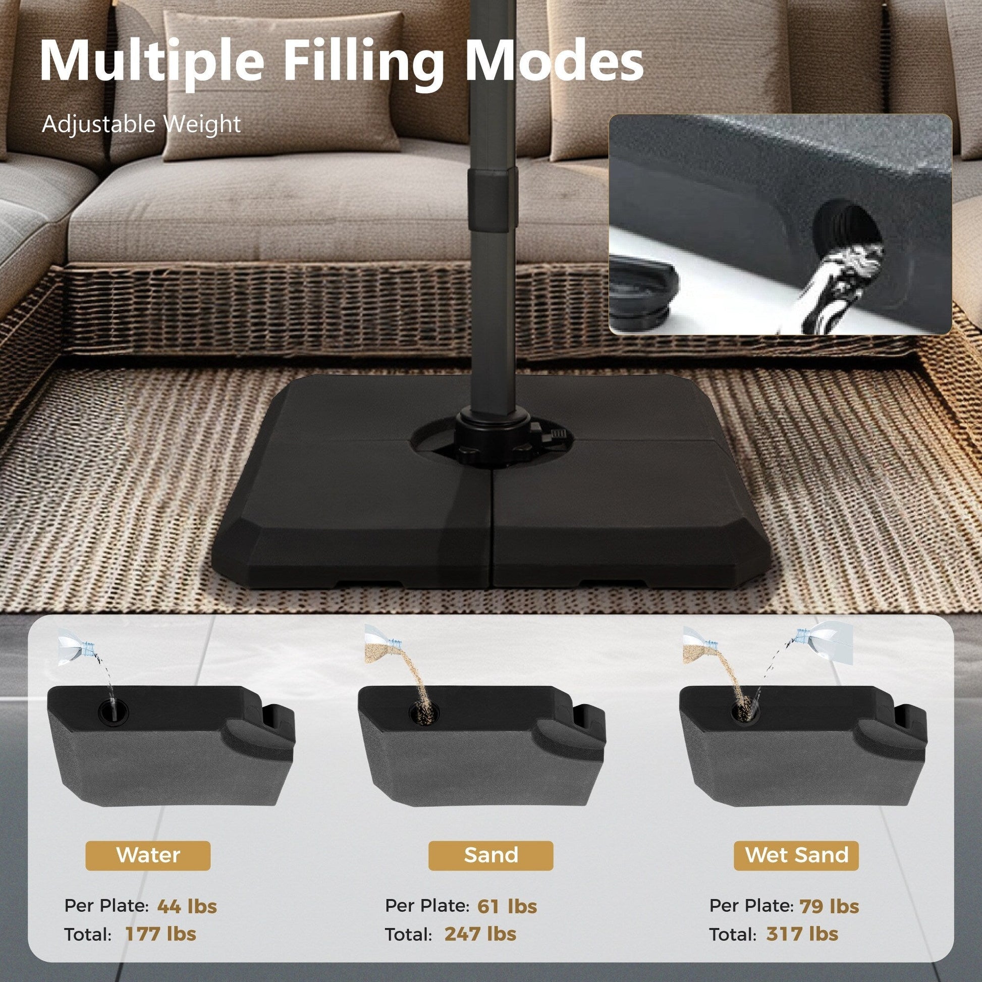 Remarque : Pour les poids, nous recommandons d'utiliser une base en 4 parties d'au moins 30 kg chacune, pour un total de 120 kg. Pour votre sécurité et pour éviter tout dommage inutile, veuillez garder le parasol fermé et bien attaché lorsqu'il y a du vent fort ou lorsqu'il n'est pas utilisé.
