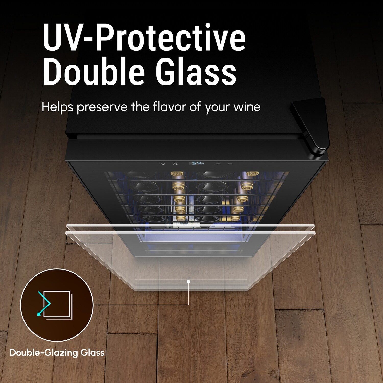 • Préservez la qualité de votre vin grâce à notre porte vitrée double vitrage à protection UV. Cette caractéristique bloque les rayons UV nocifs, garantissant que votre vin conserve son goût et son arôme parfaits.