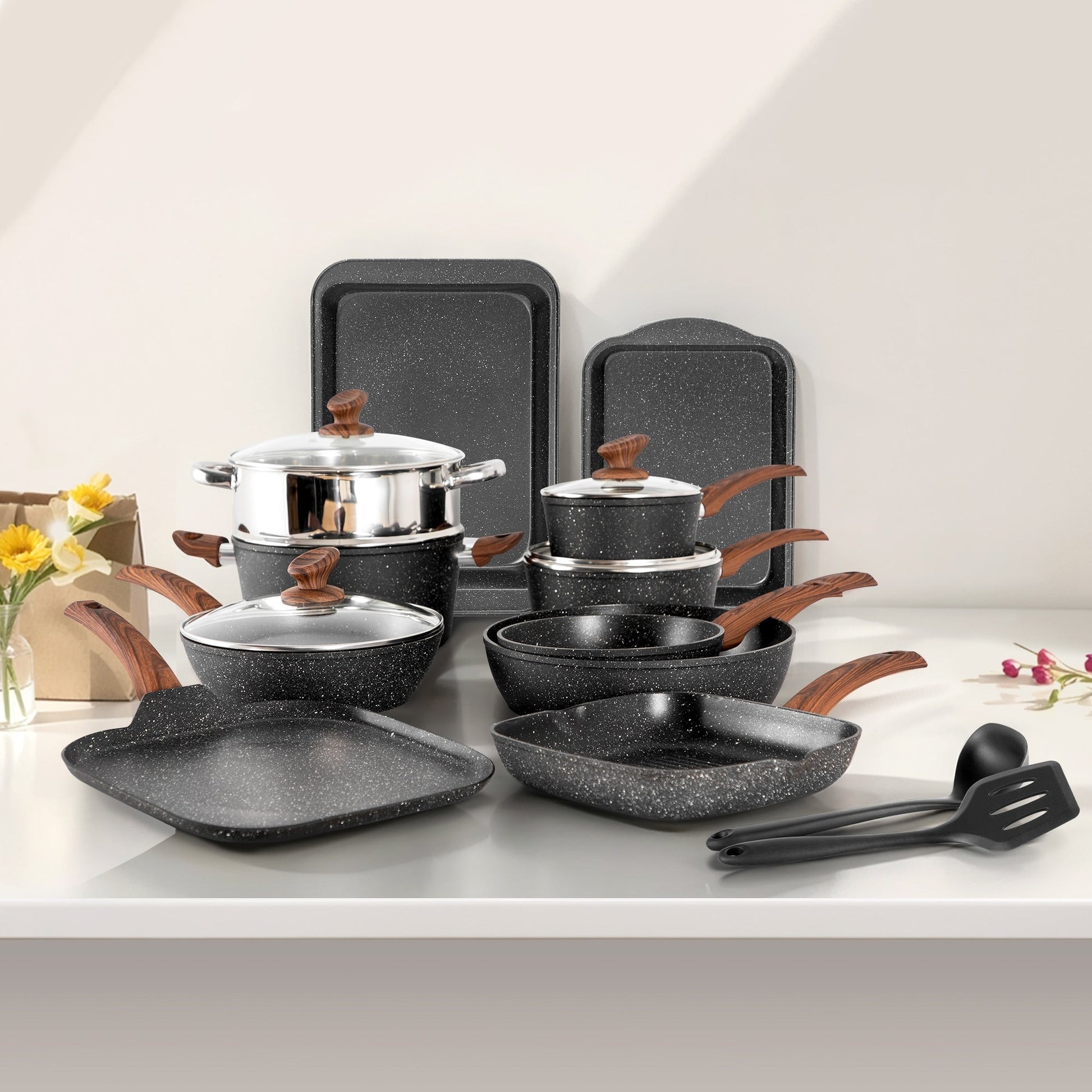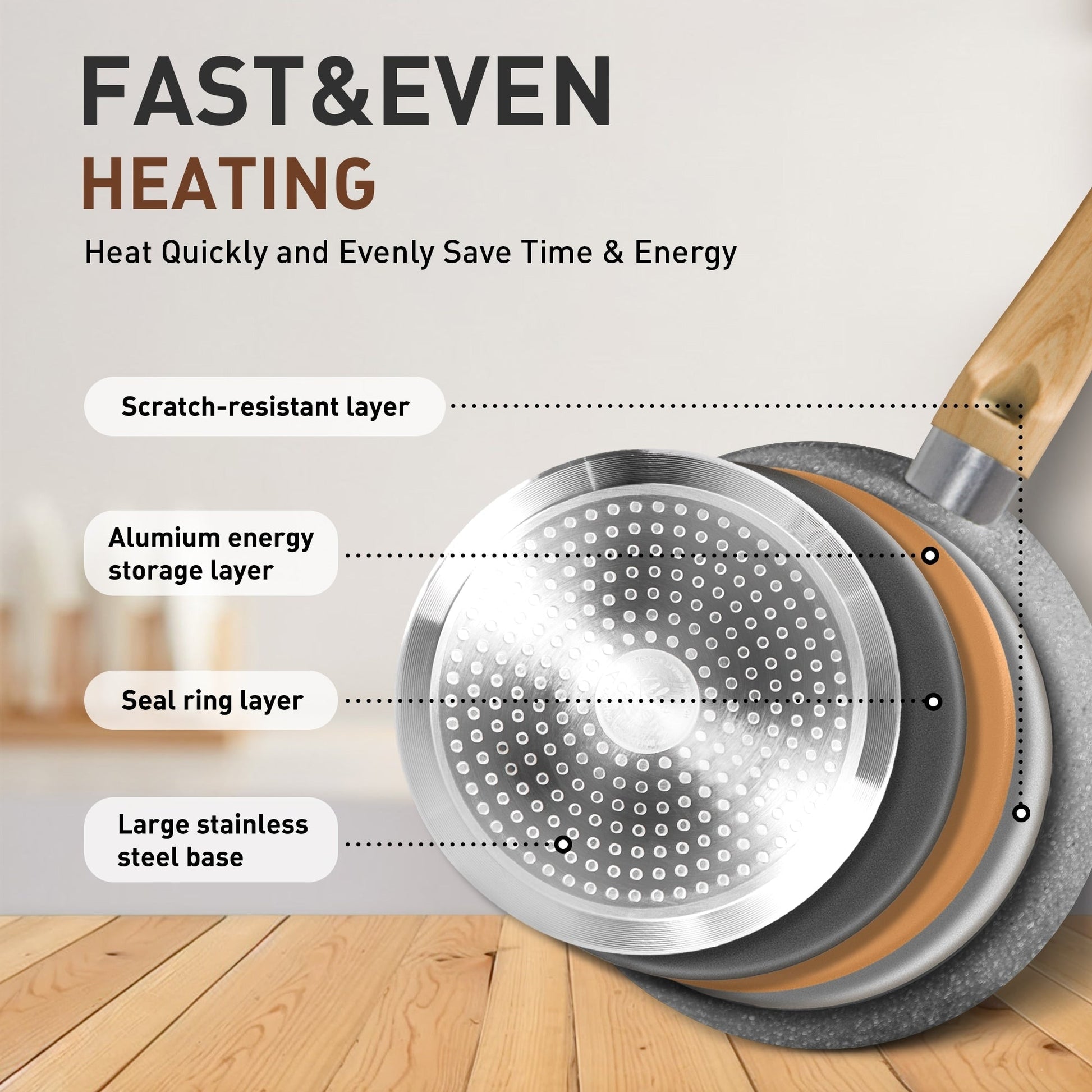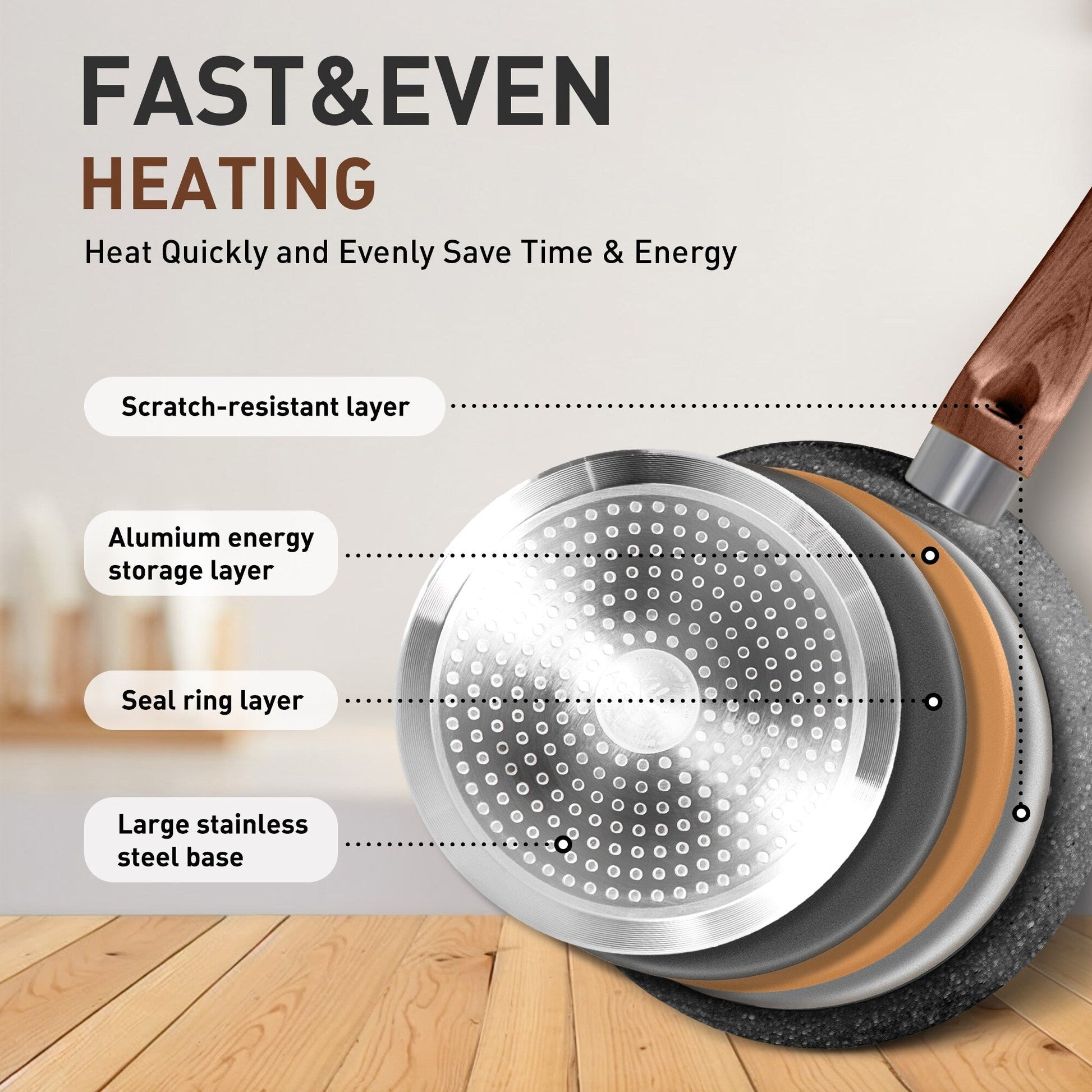 Jeu de casseroles et poêles antiadhésives : Lors de l’achat d’ustensiles de cuisine, l’un des points importants est la performance antiadhésive. Le revêtement en granit empêche efficacement les aliments de coller. De plus, vous pourrez préparer des repas plus sains pour votre famille, car vous n’aurez pas besoin d’utiliser autant d’huile. Vous pouvez cuire en toute sécurité la sauce tomate dans des casseroles et poêles en granit ; le goût et l’odeur de vos aliments ne changeront pas, même si vous utilisez des ingrédients acides ou à forte odeur.