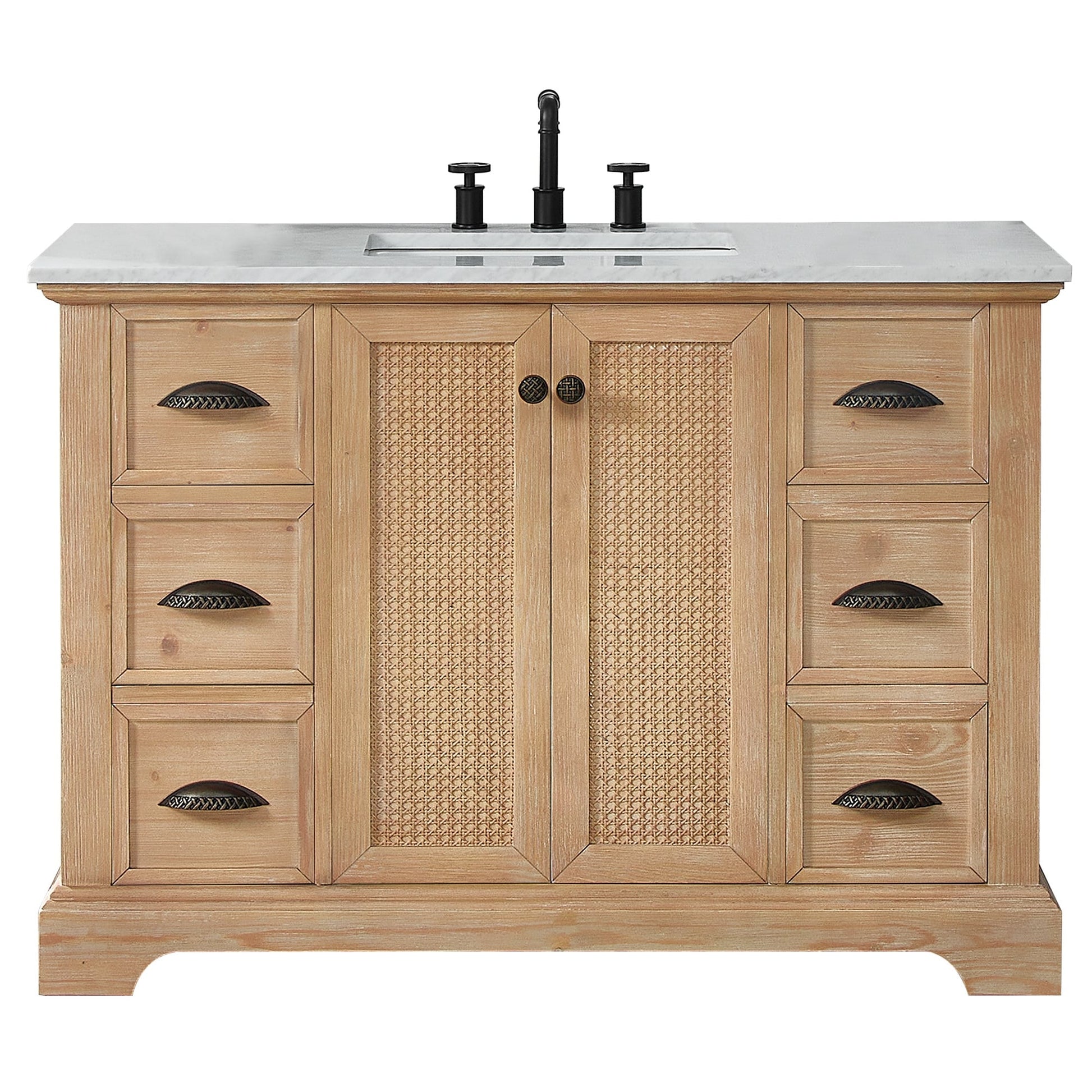 48 pouces - Deux portes à fermeture amortie avec un panneau en bambou de rotin et six tiroirs à queue d'aronde robustes et à fermeture amortie.