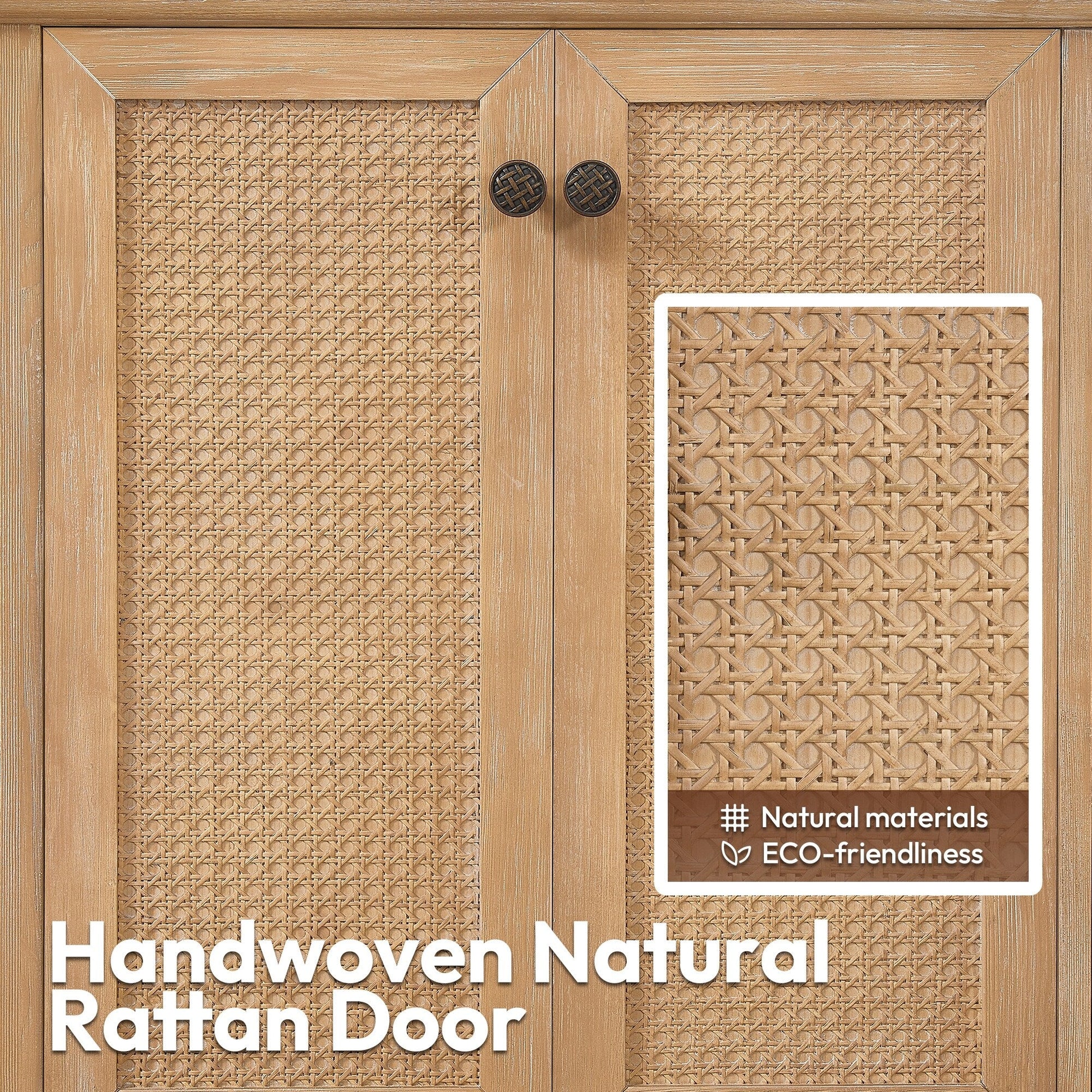 70 pouces - Quatre portes à fermeture amortie avec un panneau en bambou de rotin et trois tiroirs à queue d'aronde robustes et à fermeture amortie.