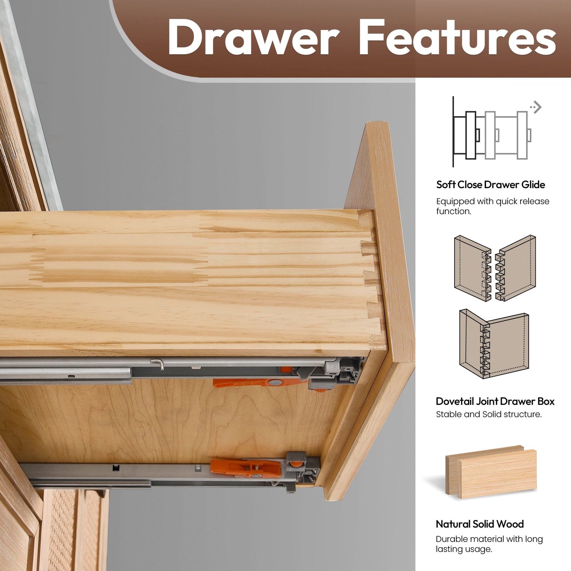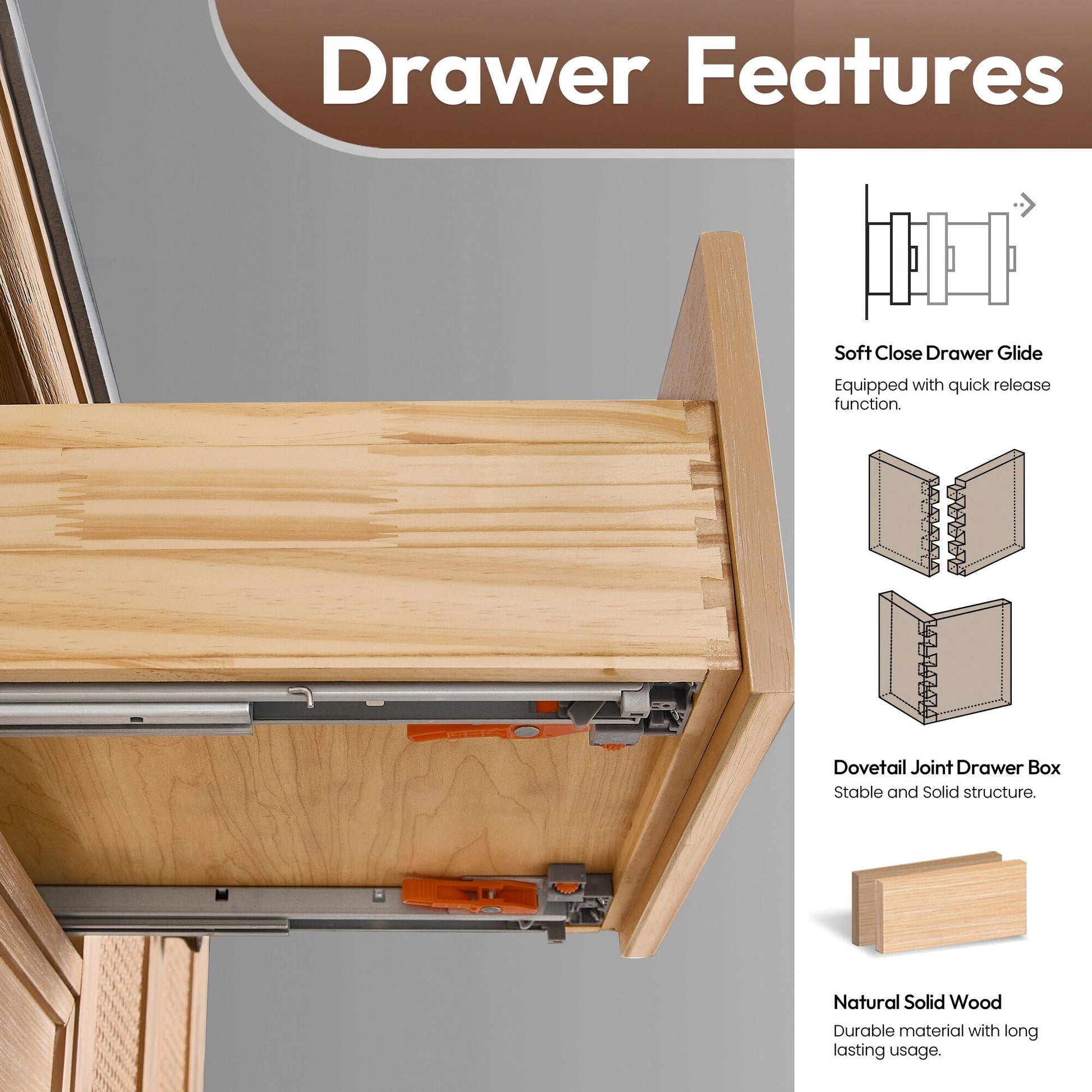 36 pouces - Une porte à fermeture amortie avec un panneau en bambou rotin et trois tiroirs à queue d'aronde robustes à fermeture amortie.