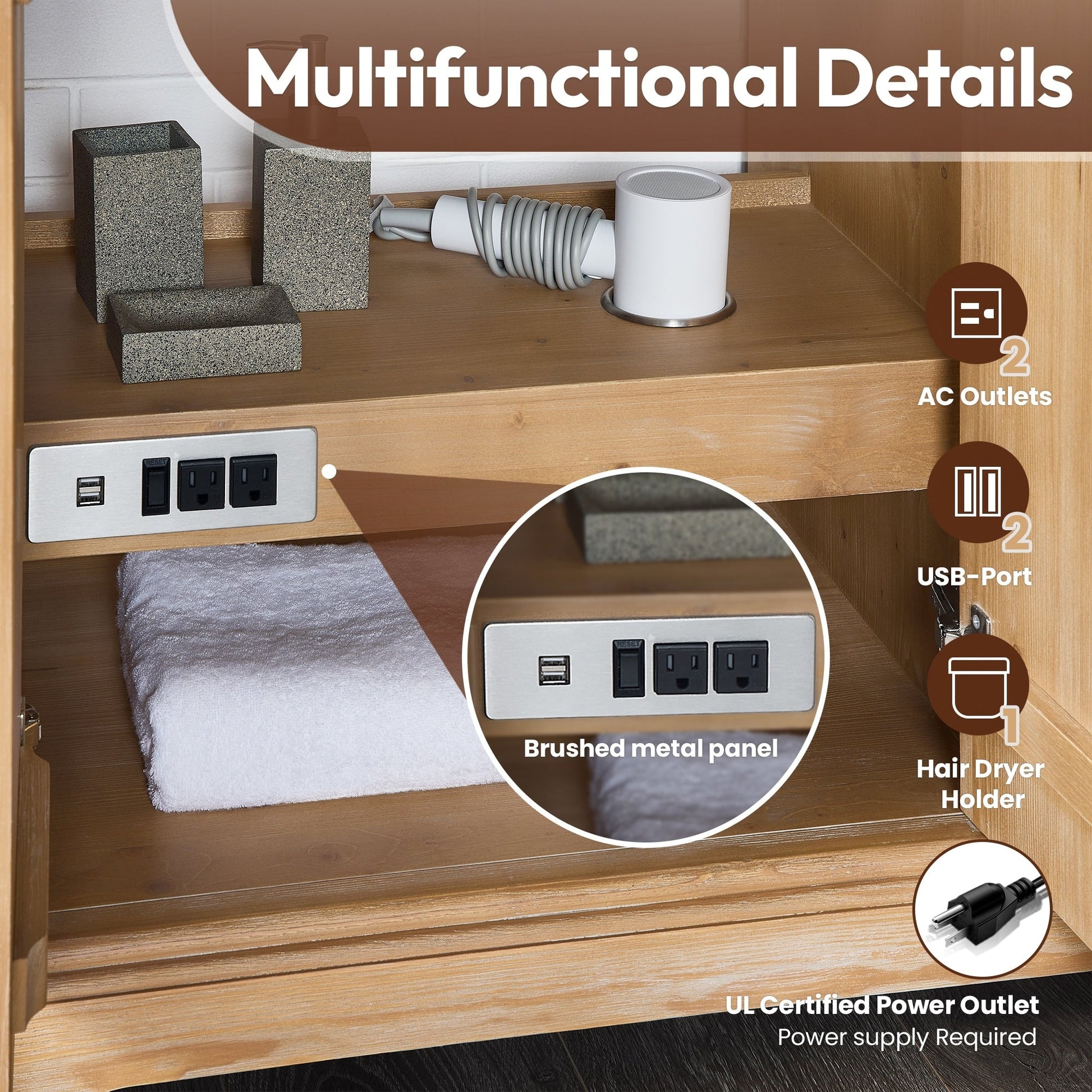 · Fonctionnalité pratique : Les prises de courant et les prises USB intégrées, homologuées par UL, offrent un moyen pratique d’alimenter les appareils de beauté et de soins personnels. Comprend un organiseur de sèche-cheveux pratique qui permet de garder votre outil préféré à portée de main.