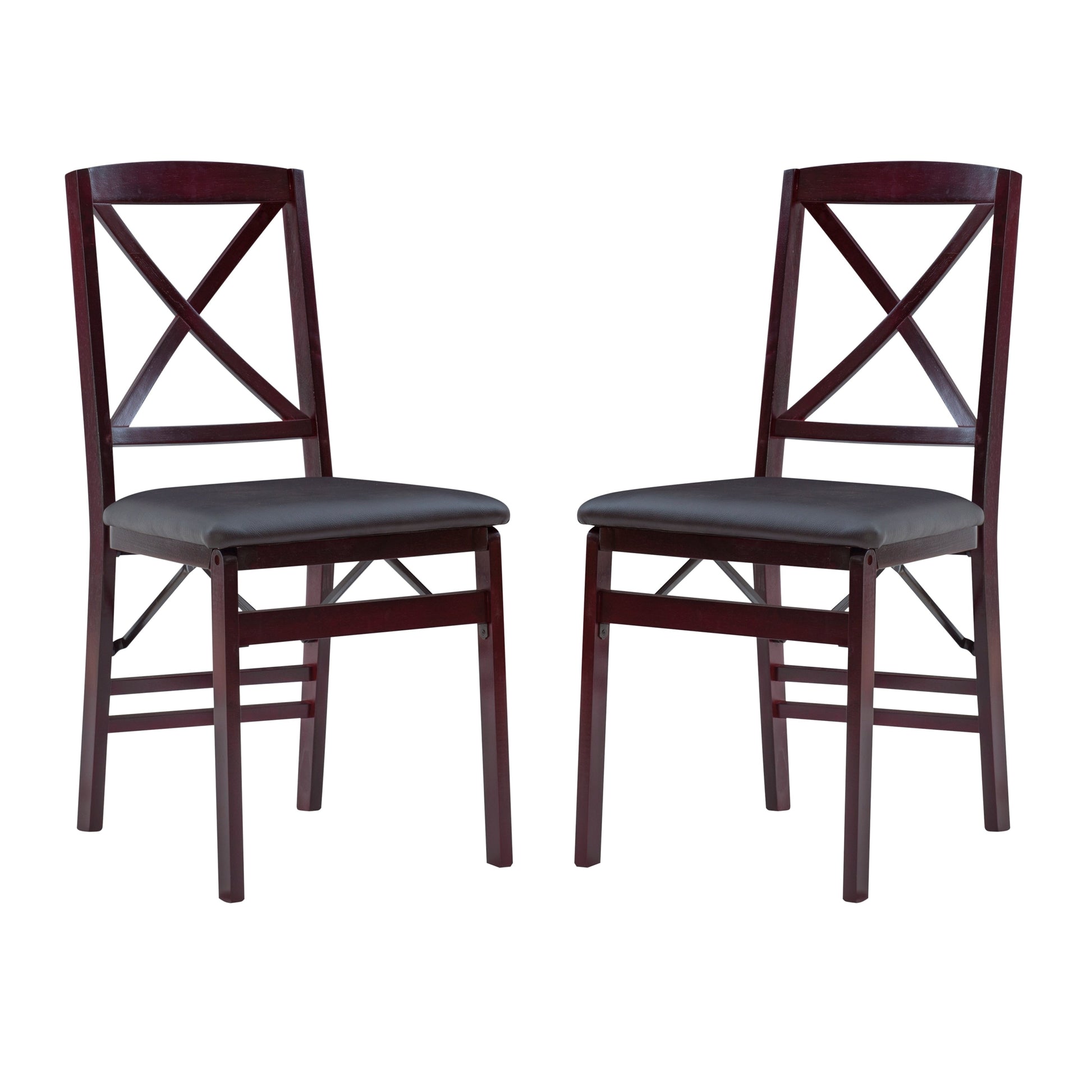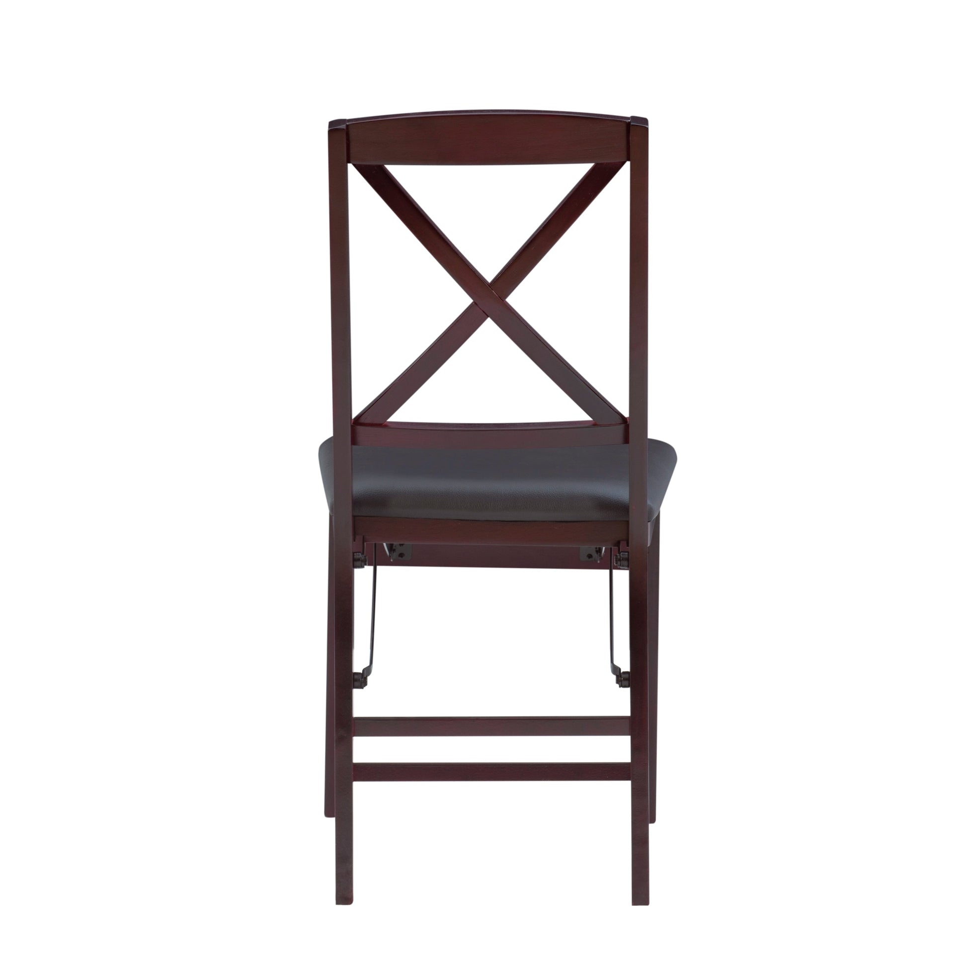 Des assises élégantes avec le côté pratique d'une chaise pliante. Ce lot de deux chaises pliantes ajoute une touche d'élégance supplémentaire pour les repas ou les réceptions. Les cadres en bois présentent un dossier classique en X et un siège rembourré en simili cuir facile à nettoyer, avec l'apparence du cuir, et une riche finition merlot. Des supports avant et arrière offrent une stabilité supplémentaire. Les chaises, qui permettent d'économiser de l'espace, se plient pour un rangement et une installation faciles. Aucun assemblage requis.