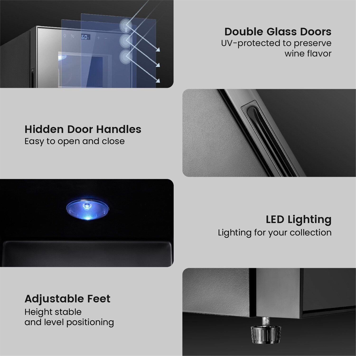 Fonctionnement silencieux : Fonctionne avec un minimum de vibrations et de bruit, offrant un environnement paisible pour que vos vins vieillissent avec élégance.