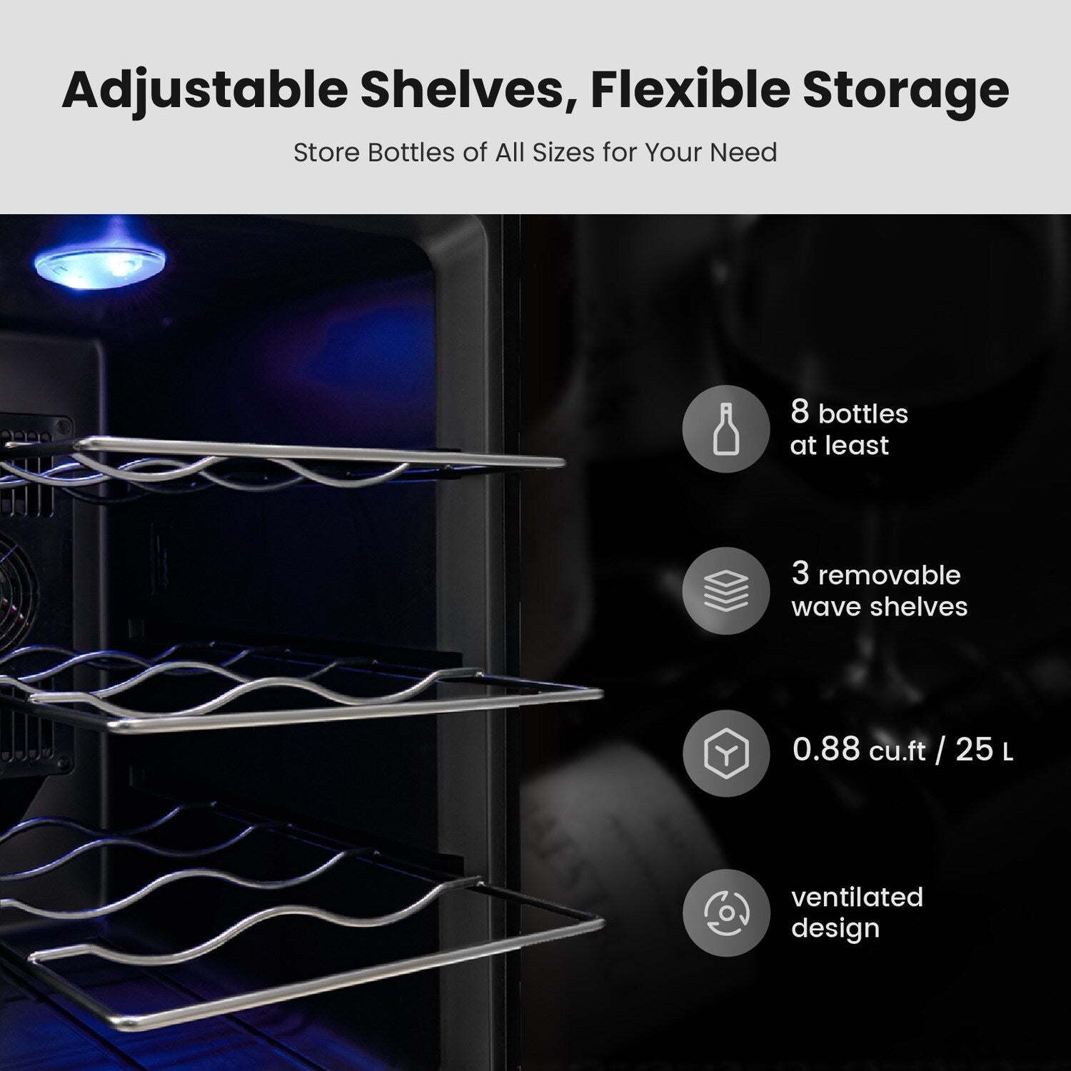 Rangement polyvalent : Peut contenir 8 bouteilles de Bordeaux standard de 750 ml avec trois rangements à vin amovibles, ce qui permet une flexibilité pour différents formats et types de bouteilles.